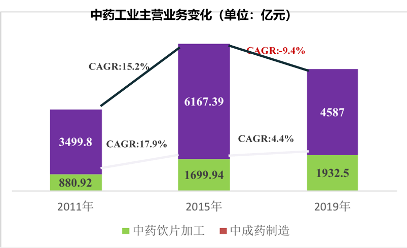 中藥飲片加工與中成藥制造一直是我國(guó)醫(yī)藥工業(yè)的重要基礎(chǔ)和增長(zhǎng)引擎,其醫(yī)藥工業(yè)主營(yíng)業(yè)務(wù)規(guī)模已達(dá)6500億,約占比整體規(guī)模的25%,僅低于化學(xué)藥品制造。近十年,中藥飲片與中成藥發(fā)展出現(xiàn)明顯分化,飲片規(guī)模雖然只有中成藥的42%,但其十年復(fù)合增長(zhǎng)達(dá)10.3%,高出醫(yī)藥工業(yè)平均水平3.7個(gè)百分比,遠(yuǎn)高于中成藥制造3.4%的增速。相比于“十二五”期間中藥產(chǎn)業(yè)的高速增長(zhǎng),“十三五”期間中藥產(chǎn)業(yè)的規(guī)模出現(xiàn)萎縮。