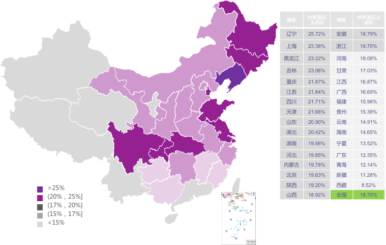 圖:我國(guó)第7次人口普查各省老齡化人口占比