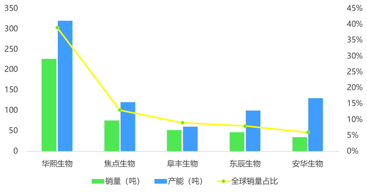 圖:2019年全球TOP5透明質(zhì)酸原料生產(chǎn)企業(yè)銷量及產(chǎn)能情況