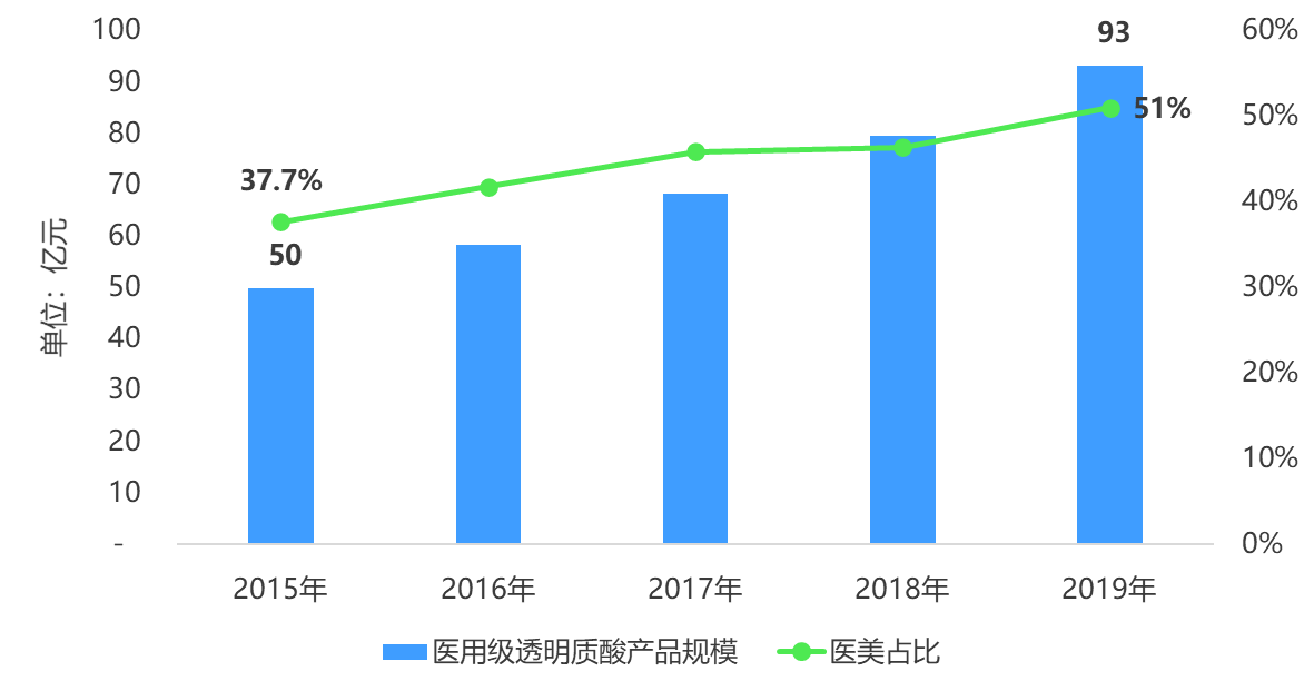 圖:醫(yī)藥級(jí)透明質(zhì)酸產(chǎn)品市場(chǎng)規(guī)模及醫(yī)美領(lǐng)域產(chǎn)品占比