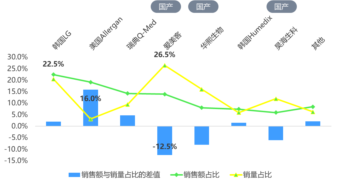 從總體格局來看,當(dāng)前我國(guó)透明質(zhì)酸填充劑以韓國(guó)LG公司的市場(chǎng)份額最高;北京愛美客的銷售量占比最高,但產(chǎn)品單價(jià)最低,其銷售額占比低于銷量占比12.5個(gè)百分點(diǎn);美國(guó)艾爾建的產(chǎn)品單價(jià)最高,其銷售額占比超過銷量占比16個(gè)百分點(diǎn)。國(guó)內(nèi)企業(yè)初步實(shí)現(xiàn)產(chǎn)品銷量的國(guó)產(chǎn)化突破,未來國(guó)產(chǎn)品牌將進(jìn)一步提升產(chǎn)品質(zhì)量和單價(jià),加速中高端產(chǎn)品的進(jìn)口替代。