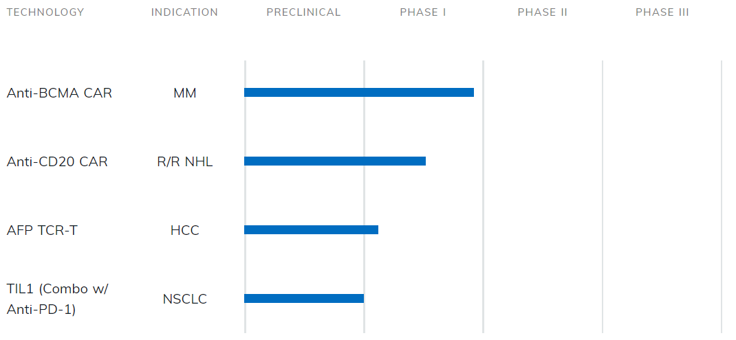 由藥明生物和巨諾醫(yī)療共同成立,目前共有7款在研產(chǎn)品,其中包括三款血液腫瘤產(chǎn)品和四款實(shí)體瘤產(chǎn)品,進(jìn)展最快的瑞基侖賽注射液(暫定)目前已經(jīng)處于上市申請(qǐng)階段。其在上海的設(shè)立的研發(fā)中心面積2500平米,建立了包括細(xì)胞治療過程開發(fā)、載體開發(fā)、流式細(xì)胞檢測(cè)、體外細(xì)胞功能檢測(cè)、分子檢測(cè)在內(nèi)的綜合細(xì)胞治療產(chǎn)品開發(fā)平臺(tái),2019年被上海市人民政府認(rèn)定為"外商投資研發(fā)中心"。另外還建有約 4000 平方米符合國際cGMP和QMS標(biāo)準(zhǔn)的生產(chǎn)車間,可以為500名患者生產(chǎn)免疫細(xì)胞治療產(chǎn)品。