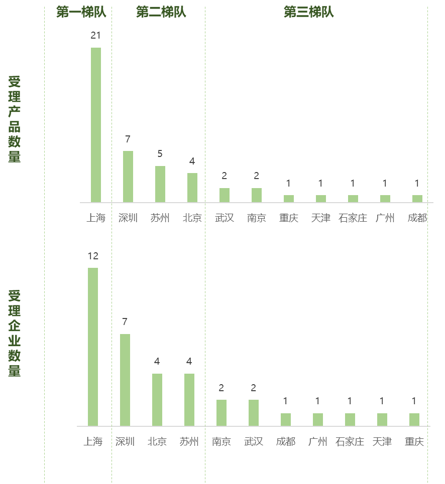 目前我國共有35家企業(yè)的40個(gè)產(chǎn)品獲得CDE受理,上海無論是產(chǎn)品數(shù)量還是企業(yè)數(shù)量均遙遙領(lǐng)先處于第一梯隊(duì),深圳、蘇州、北京處于第二梯隊(duì),武漢、南京、重慶、天津、石家莊、廣州、成都則處于第三梯隊(duì)。