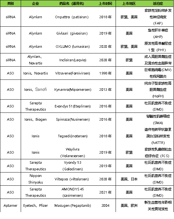 小核酸藥物主要包括反義核酸(ASO)、小干擾RNA(siRNA)、微小RNA(miRNA)、小激活RNA(saRNA)、信使RNA(mRNA)適配體(aptamer)、核酶(ribozyme)、抗體核酸偶聯(lián)藥物(ARC)等。目前全球上市的小核酸藥物共有14款,包括4款siRNA藥物和9款A(yù)SO,1款核酸適配體,約80%的產(chǎn)品是2015年以后上市,絕大多數(shù)適應(yīng)癥為遺傳病。Ionis、Alynlam、Sarepta是小核酸藥物三巨頭,擁有豐富的研發(fā)管線。