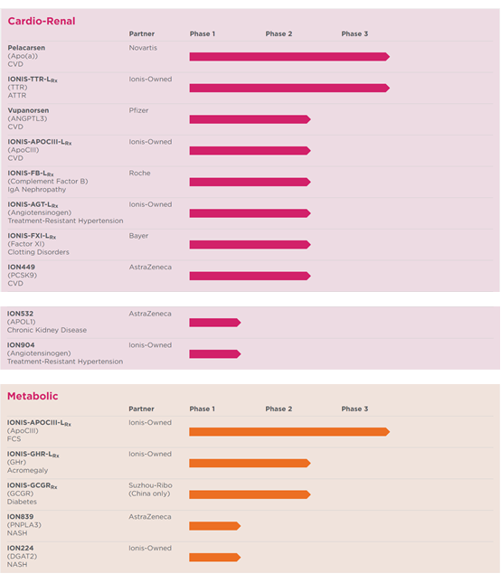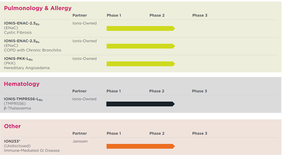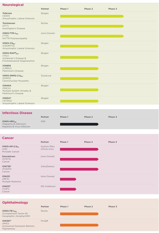 Ionis是全球反義核酸藥物研究和開(kāi)發(fā)的領(lǐng)頭羊,基于自身專有的配體共軛反義技術(shù)LICA,Ionis建立了豐富的首創(chuàng)藥物和最佳藥物的研發(fā)管線,包含超過(guò)三十多個(gè)在研品種,適應(yīng)癥覆蓋心血管、代謝、神經(jīng)、呼吸系統(tǒng)、眼科、癌癥、傳染病等領(lǐng)域。其藥品Spinraza(Nusinersen)在包括美國(guó)、中國(guó)在內(nèi)的全球多個(gè)國(guó)家獲批上市,用于治療兒童和成人的脊髓性肌萎縮(SMA),治療費(fèi)用高達(dá)75萬(wàn)美元/年,2019年銷售額達(dá)21億美元,是全球銷售額最高的小核酸藥物。