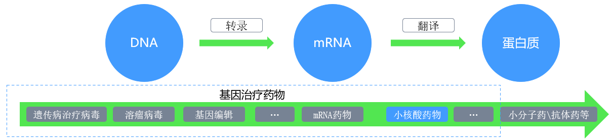 基因藥物通常由含工程化基因構(gòu)建體的載體或遞送系統(tǒng)組成,其活性成分可為DNA?RNA?基因改造的病毒?細(xì)菌或細(xì)胞,通過(guò)將外源基因?qū)氚屑?xì)胞或組織,替代?補(bǔ)償?阻斷?修正特定基因,以達(dá)到治療和預(yù)防疾病的目的。基因藥物是當(dāng)今最前沿的藥物開(kāi)發(fā)領(lǐng)域之一,在治療遺傳病、癌癥、糖尿病,預(yù)防傳染病等方面正不斷取得突破性進(jìn)展,主要包括遺傳病治療病毒、溶瘤病毒、基因編輯藥物、mRNA藥物、小核酸藥物等,本文將重點(diǎn)對(duì)小核酸藥物進(jìn)行介紹。