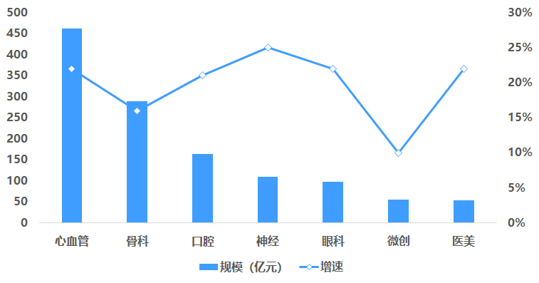 從規(guī)模上看,心血管耗材和骨科耗材是高值耗材領(lǐng)域中規(guī)模較大的細分賽道,規(guī)模占比合計已超過60%;而眼科、微創(chuàng)和醫(yī)美耗材市場規(guī)模均處于平均線以下。從增速上看,重點細分領(lǐng)域的平均增速為20%,神經(jīng)、心血管、眼科、醫(yī)美和口腔耗材均在平均線以上保持較快的增長速度,其中神經(jīng)耗材增速最快;而骨科和微創(chuàng)耗材增速相對較為平穩(wěn)。