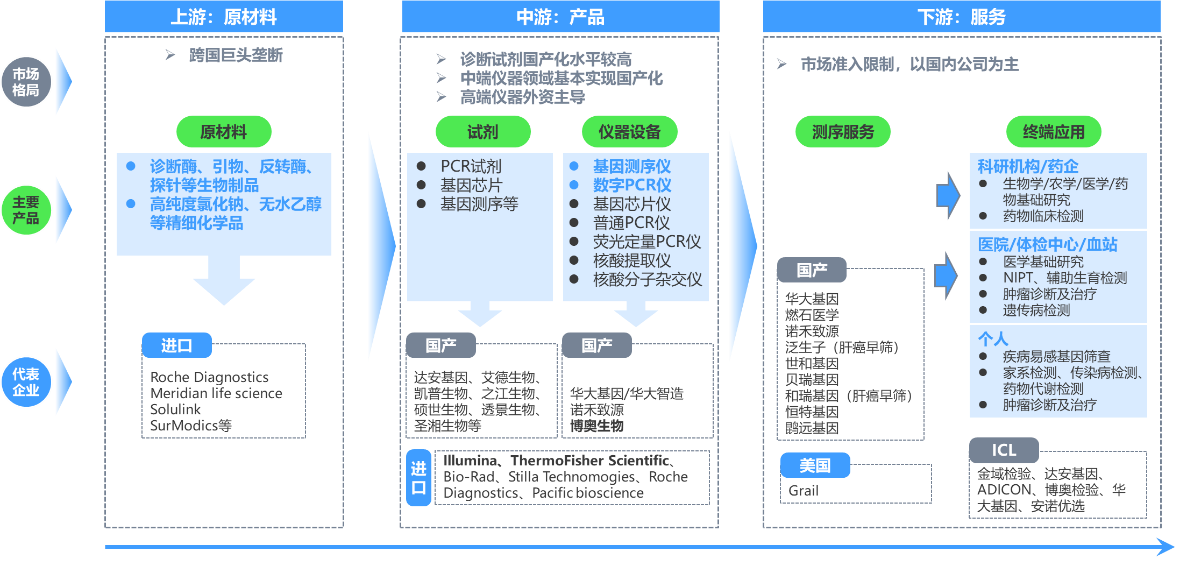 分子診斷產(chǎn)業(yè)鏈由上游原材料、中游產(chǎn)品、下游服務(wù)組成。其中,上游原材料主要包括生物制品和精細(xì)化學(xué)品,中端產(chǎn)品主要包括診斷試劑和儀器設(shè)備,下游服務(wù)主要包括中間環(huán)節(jié)的基因測序服務(wù)和對于試劑、儀器和測序服務(wù)最終使用的應(yīng)用終端。