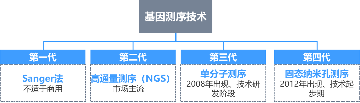 基因測序技術(shù)包括第一代測序技術(shù)(Sanger法)、第二代高通量測序(NGS)及三、四代測序,其中一代測序的成本過高、通量較小不適于商用,但由于其高達(dá)99.99%精確度,目前仍應(yīng)用于科研領(lǐng)域。二代NGS高通量測序技術(shù)為當(dāng)前市場主流,自2005年以來快速發(fā)展,并憑借其高通量、準(zhǔn)確度高、可以多重檢測、所需樣本量少等優(yōu)點,被廣泛應(yīng)用于醫(yī)學(xué)研究和臨床檢測,檢測成本遠(yuǎn)遠(yuǎn)低于一代測序,但精確度相對較低。應(yīng)用方面,NGS在NIPT領(lǐng)域的應(yīng)用最為成熟,在癌癥早篩和個體化用藥等領(lǐng)域前景廣闊。三代單分子測序和四代納米孔測序,目前尚處于研發(fā)階段。