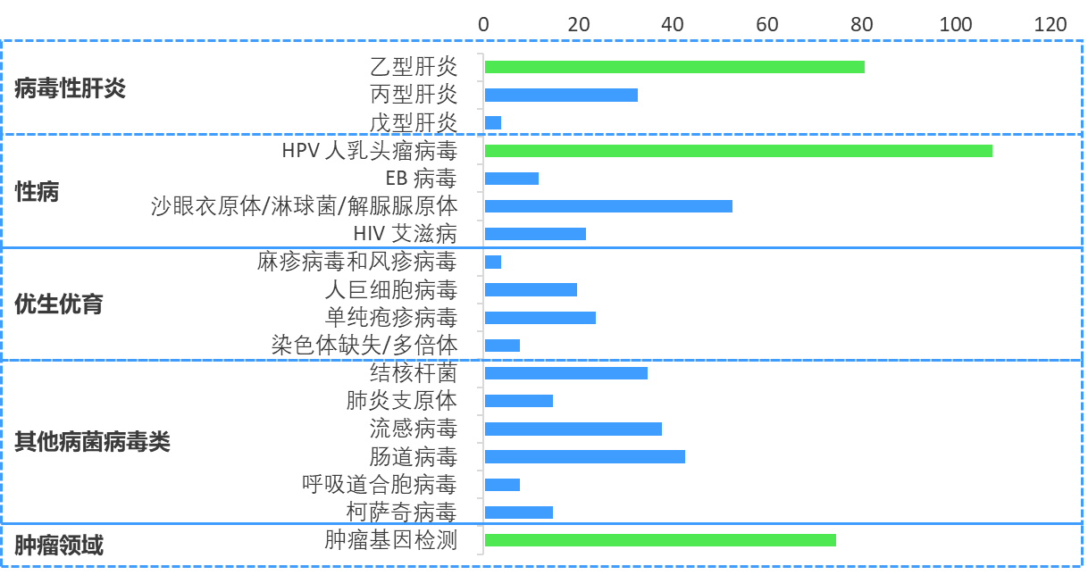 已獲批的診斷試劑產(chǎn)品數(shù)量眾多,已經(jīng)超600個,主要應(yīng)用于病毒性肝炎、性病、優(yōu)生優(yōu)育、其他病菌病毒類、腫瘤領(lǐng)域等五大病種、18大診斷領(lǐng)域中,其中在HPV人乳頭瘤病毒檢測、乙型肝炎檢測和腫瘤基因檢測領(lǐng)域的產(chǎn)品數(shù)最多,均超過70個,占產(chǎn)品總量的44%。